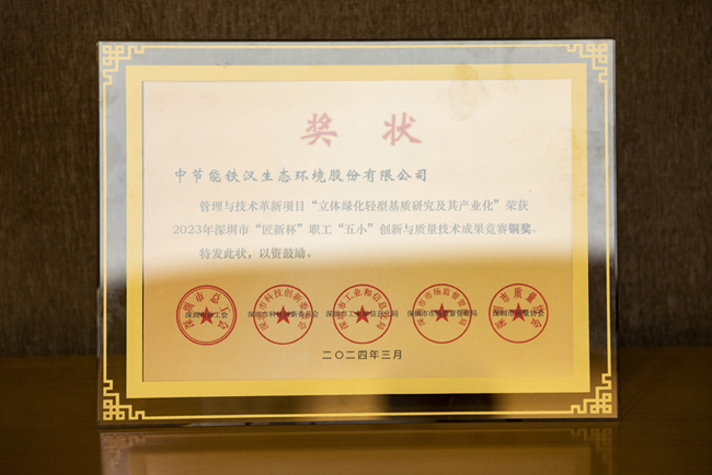 4月12日,由深圳市質(zhì)量協(xié)會(huì)主辦的質(zhì)量創(chuàng)新促企業(yè)高質(zhì)量發(fā)展大會(huì)在深圳市南山區(qū)舉行,并為2023年深圳市“匠新杯”職工“五小”創(chuàng)新與質(zhì)量技術(shù)成果競(jìng)賽獲獎(jiǎng)單位頒獎(jiǎng)。中節(jié)能鐵漢管理與技術(shù)革新項(xiàng)目“立體綠化輕型基質(zhì)研究及其產(chǎn)業(yè)化”榮獲該項(xiàng)賽事銅獎(jiǎng)。