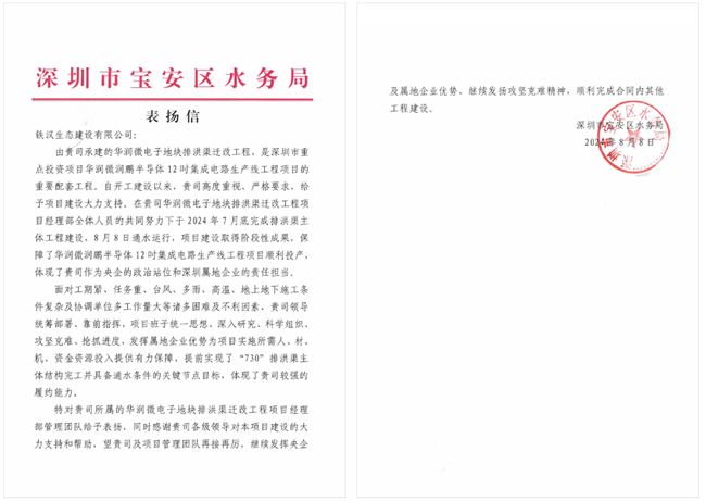 寶安區(qū)水務(wù)局《表揚信》指出,自項目開工建設(shè)以來,鐵漢建設(shè)高度重視、嚴(yán)格要求,給予項目建設(shè)大力支持。期間,面對工期緊、任務(wù)重,臺風(fēng)、多雨、高溫、地上地下施工條件復(fù)雜及協(xié)調(diào)單位多、工作量大等諸多困難及不利因素,鐵漢建設(shè)統(tǒng)籌部署、靠前指揮,項目班子科學(xué)組織、攻堅克難、搶抓進度,發(fā)揮屬地企業(yè)優(yōu)勢為項目實施所需人、材、機、資金資源投入提供有力保障,提前實現(xiàn)了“730”排洪渠主體結(jié)構(gòu)完工并具備通水條件的關(guān)鍵節(jié)點目標(biāo),體現(xiàn)了較強的履約能力。8月8日,項目順利通水運行,保障了華潤微潤鵬半導(dǎo)體12吋集成電路生產(chǎn)線工程項目順利投產(chǎn),體現(xiàn)了作為央企的政治站位和深圳屬地企業(yè)的責(zé)任擔(dān)當(dāng)。