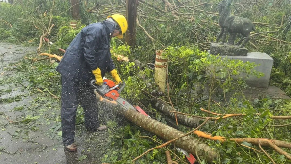 救災(zāi)現(xiàn)場,受臺風(fēng)“摩羯”侵襲,樹木傾倒?jié)M地,一片狼藉。彼時,臺風(fēng)“摩羯”殘余環(huán)流依舊帶來大雨,且受制于場地原因,無法進(jìn)駐大型設(shè)備。