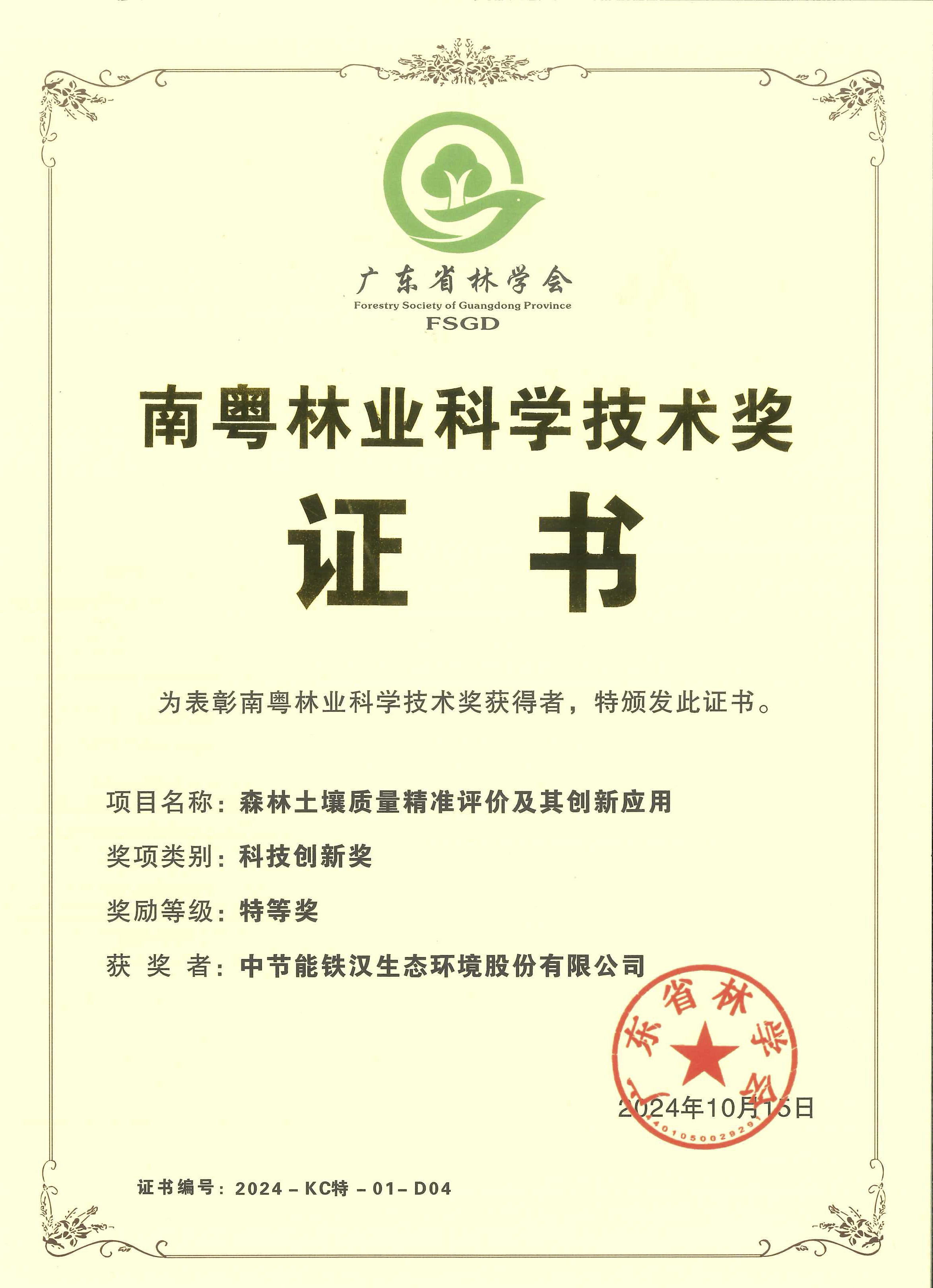 近日,廣東省林學(xué)會第六屆南粵林業(yè)科學(xué)技術(shù)獎評審結(jié)果揭曉,由中節(jié)能鐵漢生態(tài)環(huán)境股份有限公司聯(lián)合廣東省林業(yè)科學(xué)研究院、中山大學(xué)等單位共同申報的《森林土壤質(zhì)量精準(zhǔn)評價利用及生態(tài)修復(fù)》成果再獲殊榮,榮獲該獎項科技創(chuàng)新類“特等獎”。該成果早前還榮獲了第十九屆中國土壤學(xué)會科學(xué)技術(shù)獎二等獎。