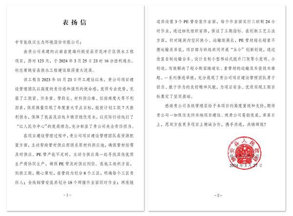 姚安縣人民政府專程發(fā)來(lái)《表?yè)P(yáng)信》,指出,項(xiàng)目自2023年11月23日開工建設(shè)以來(lái),中節(jié)能鐵漢項(xiàng)目建設(shè)管理團(tuán)隊(duì)以高度的責(zé)任感和強(qiáng)烈的使命感,發(fā)揮專業(yè)優(yōu)勢(shì),克服了工期緊、任務(wù)重、管段長(zhǎng)、材料供應(yīng)難、征拆難度大等不利因素,保質(zhì)保量實(shí)現(xiàn)了年度重大節(jié)點(diǎn)目標(biāo)并提前7天供水,保障了姚安縣及沿線鄉(xiāng)鎮(zhèn)百姓飲用水,對(duì)助力當(dāng)?shù)剜l(xiāng)村振興具有重要作用,以實(shí)際行動(dòng)踐行了“以人民為中心”的發(fā)展理念,充分彰顯了央企責(zé)任擔(dān)當(dāng)。