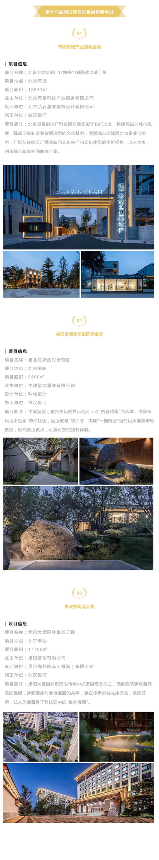 近日,第十四屆園冶杯國際競賽評審結(jié)果出爐,中節(jié)能鐵漢所屬鐵漢星河獲得3項(xiàng)大獎,北京衛(wèi)星制造廠17幢等11項(xiàng)裝修改造工程項(xiàng)目獲得市政景觀獎產(chǎn)業(yè)園類金獎,崔各莊奶西村示范區(qū)項(xiàng)目獲得住區(qū)景觀獎示范區(qū)類金獎,旭陽大廈園林景觀工程項(xiàng)目獲得市政景觀獎大獎。